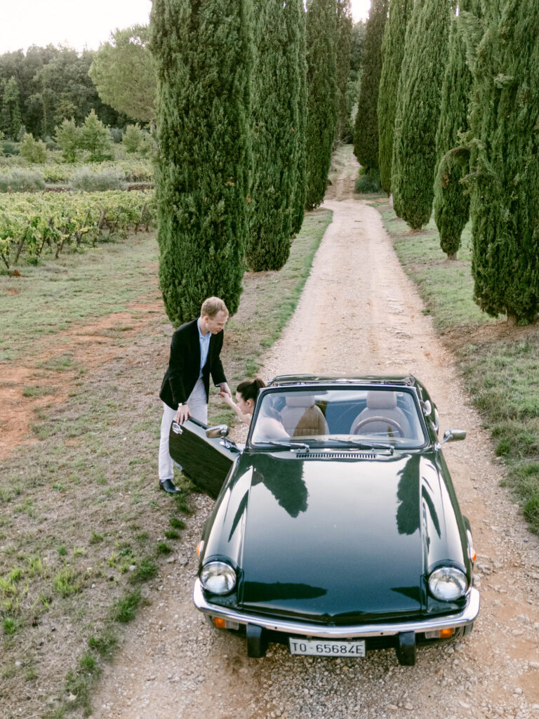 Before the welcome festivities began, we took advantage of the golden Tuscan light for a relaxed and romantic photo session with a vintage car. Surrounded by cypress trees and rolling hills, Kelsey and Alex embraced the quiet moments together before the weekend’s celebrations fully unfolded.